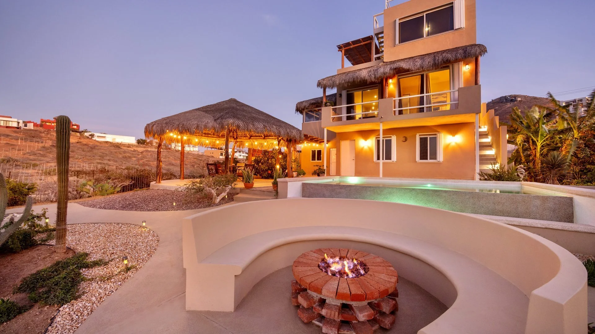 Nestled in the exclusive and sought-after Gavilan neighborhood of Baja Sur, this stunning property offers the ultimate in luxury living with epic, unobstructed views. Built in 2021, the beautifully designed 1,700 sq. ft. home features 2 spacious bedrooms and 3 elegant bathrooms, seamlessly blending modern comfort with timeless style. The outdoor space is a true entertainer’s dream, boasting a palapa-covered lounge area, a built-in BBQ, and a gas fire pit, all centered around a heated infinity pool that seems to merge with the horizon. The rooftop area, completely unblockable, provides the perfect vantage point for breathtaking sunsets and stargazing under the Baja sky. Surrounded by mature, lush landscaping supported by an efficient irrigation system, the property is as low-maintenance as it is stunning. Sustainability meets convenience with a solar power system, a whole-house filtration system, and a spacious garage for storage. This exquisite home invites you to enjoy the best of Baja living—luxury, tranquility, and unparalleled natural beauty.